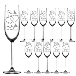Interlocked Hearts Engraved Wedding Glass Champagne Flutes Set of 12